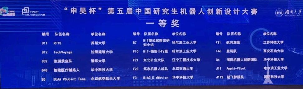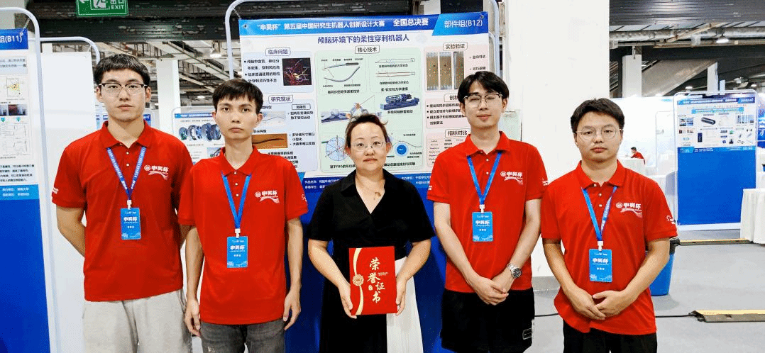 近日,由教育部学位管理与研究生教育司指导,中国学位与研究生教育学会、中国科协青少年科技中心主办,湖南大学承办的“申昊杯”第五届中国研究生机器人创新设计大赛在长沙圆满闭幕。大赛共计近240所高校及科研院所的1177支队伍参加,经初赛评审,最终有来自96所高校和科研院所的288支队伍进入决赛。决赛经过现场评审、分组答辩和冠军争夺赛三个环节的激烈角逐后,最终我校必赢242net官网教师李杰带队指导的“TechVoyage”研究生团队——袁吴越(2021级)、邓伟权(2022级)、张恩昊(2022级)、沈记(2022级)携参赛作品《颅脑环境下的柔性穿刺机器人》斩获大赛一等奖,这也是我院学生首次获得该项赛事一等奖。指导教师李杰获评大赛“优秀指导教师”。